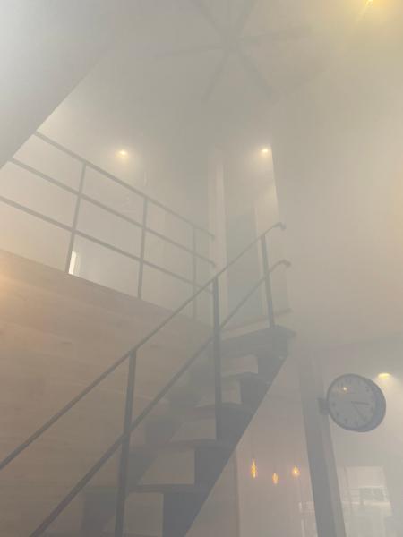噴霧中。建物いっぱいに霧状のミストが行きわたります。